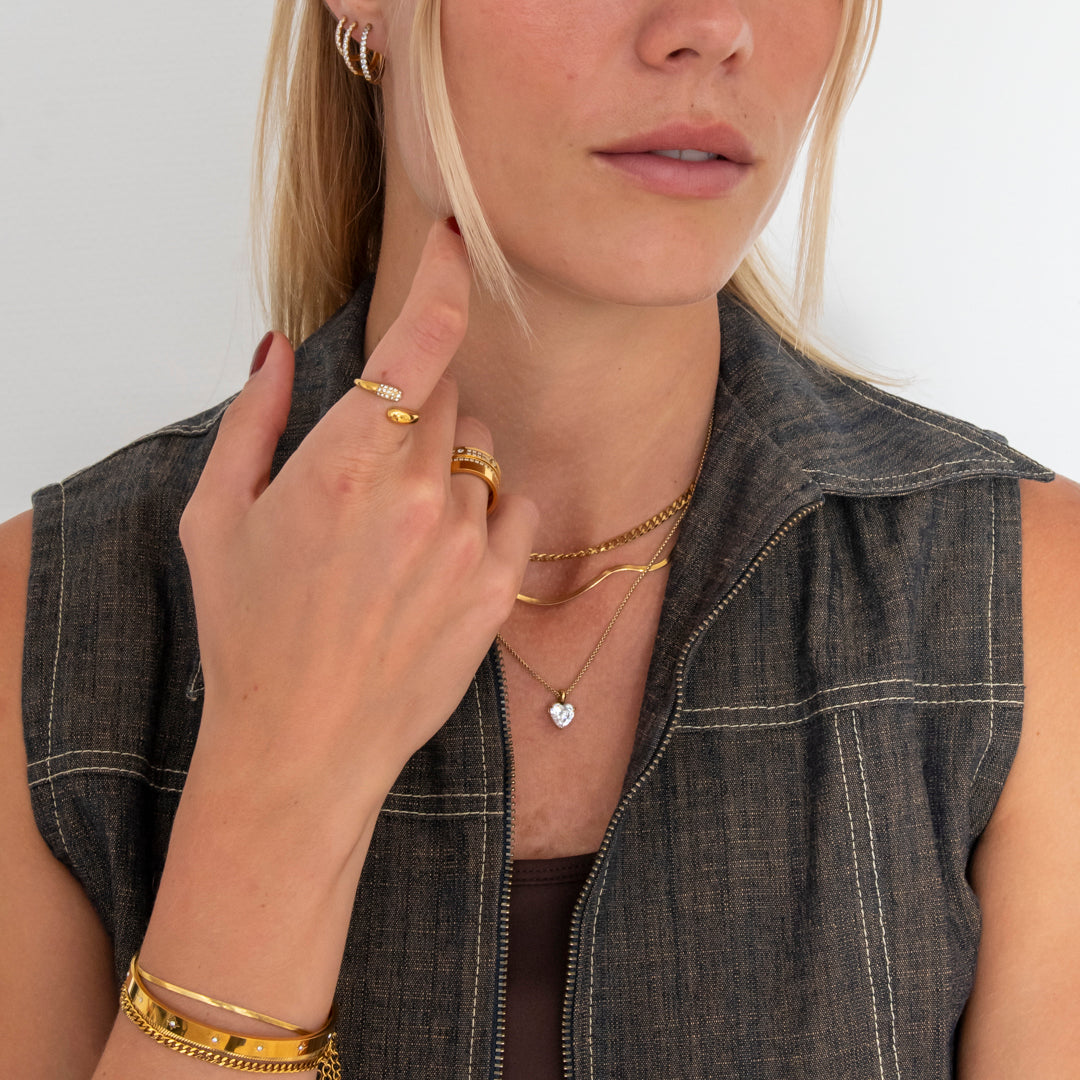 En moderne og elegant ring med et organisk formsprog, hvor den åbne silhuet skaber et let og sofistikeret udtryk. Den ene ende prydes af funklende zirkonia-sten, mens den anden har en blød, poleret overflade – en perfekt balance mellem glans og minimalisme.