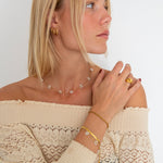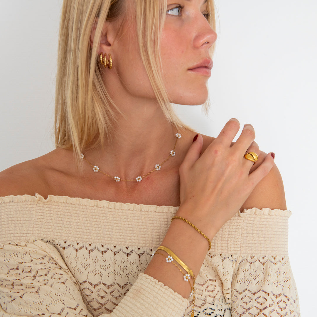 Fin og feminin halskæde med små hvide blomster, der giver et rent og romantisk udtryk. Den gyldne kæde tilføjer et strejf af varme og skaber en perfekt balance mellem sødme og elegance.