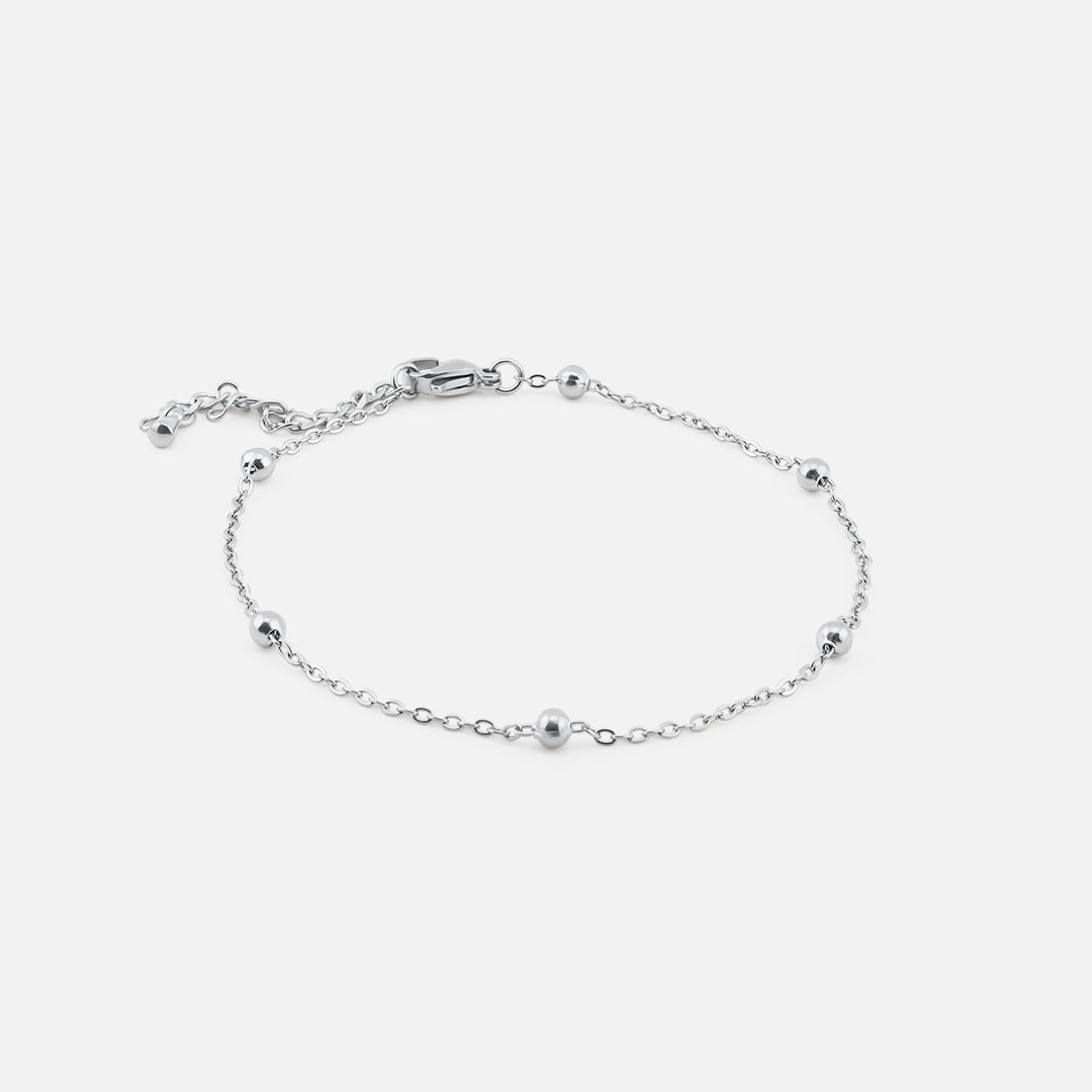 Elegant ankelkæde med små, blanke kugler, der fanger lyset ved hvert skridt. Det enkle og feminine design giver et sofistikeret touch – perfekt til både sandaler om sommeren og sneakers i hverdagen.
