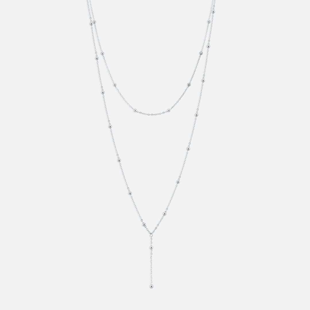 Delikat halskæde i lag-på-lag-design med fine kæder og små kugledetaljer, der fanger lyset ved enhver bevægelse. Det elegante fald skaber en let og sofistikeret silhuet, perfekt til både hverdag og festlige anledninger.