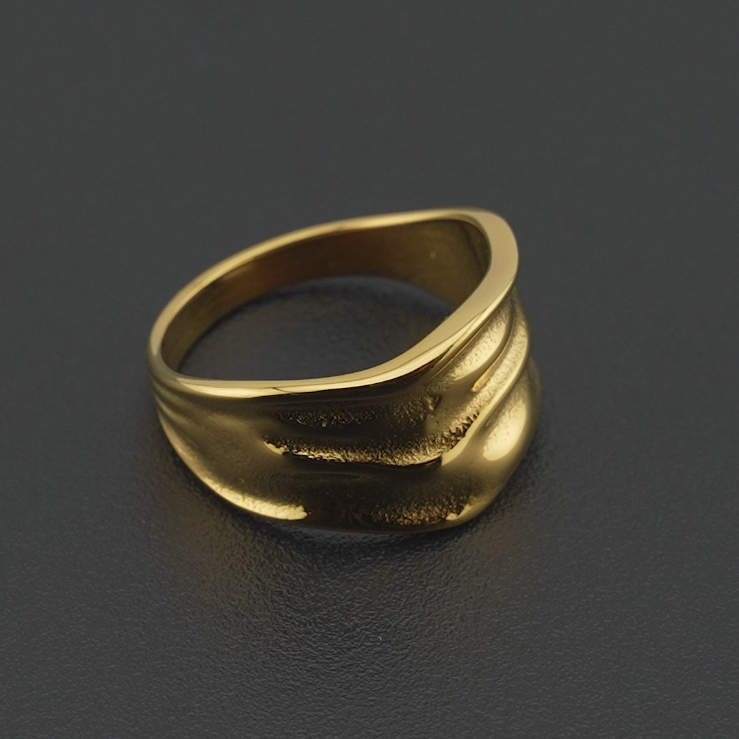 En ring med et drømmende og flydende udtryk, hvor overfladen nærmest ser ud til at være i bevægelse. De glatte, bløde former fanger lyset i bølger og skaber en levende, sanselig glød. Et smykke der føles både moderne og kunstnerisk – som et lille stykke bærbar skulptur.