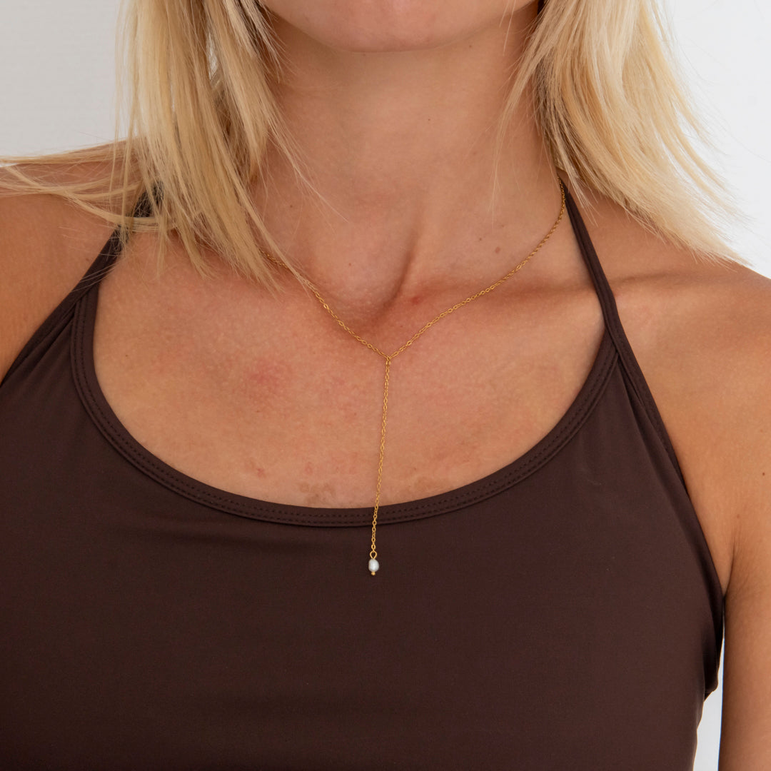 Elegant halskæde med en enkelt dråbeformet ferskvandsperle, der hænger yndefuldt fra en slank gylden kæde. Det minimalistiske design udstråler tidløs elegance og femininitet – perfekt til både hverdag og særlige anledninger.