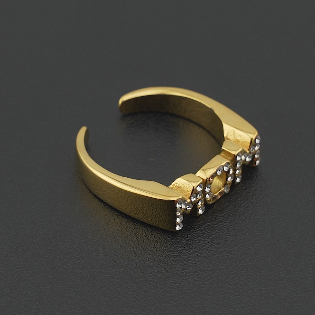 En rørende og funklende ring med ordet MOM, dækket af små klare sten, der lyser op som hjertets taknemmelighed. Det åbne design giver ringen et moderne og personligt udtryk – perfekt som en hyldest til den stærkeste kvinde i dit liv, eller som en kærlig gave til dig selv.