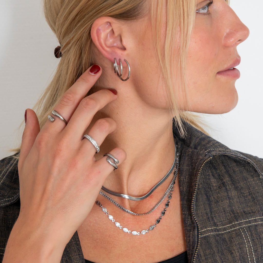 Elegant og moderne ring med et organisk, flydende design, der smyger sig blødt om fingeren. Den åbne form giver et sofistikeret og samtidig dristigt udtryk – en perfekt balance mellem minimalisme og statement.