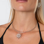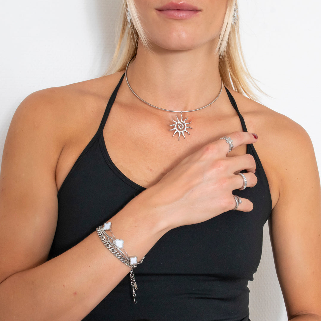 Kraftfuld choker med et markant solvedhæng, hvor spiralens centrum og de hamrede stråler fanger lyset i et råt og energisk design. Et statement-piece, der udstråler selvtillid og attitude.