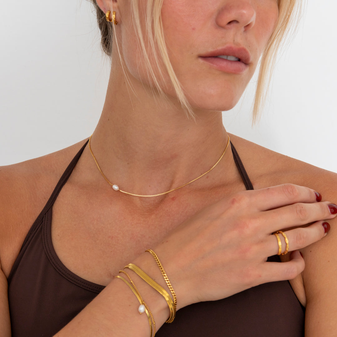 Enkel og elegant halskæde med en smuk perle placeret asymmetrisk på en fin gylden kæde. Det minimalistiske design giver et moderne twist på klassisk perleelegance – perfekt til dig, der elsker diskret luksus og tidløs stil.