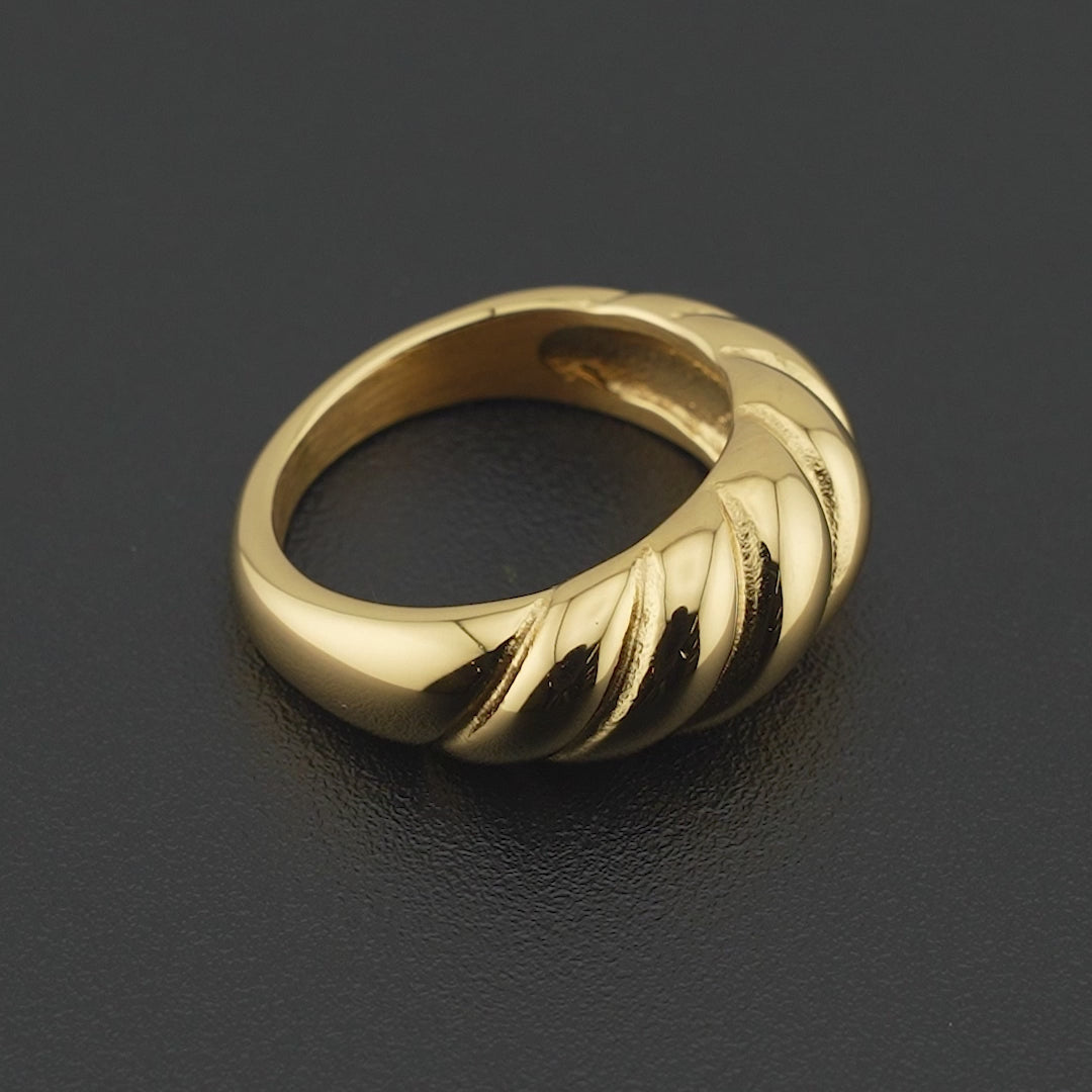 En fyldig og stilfuld ring med snoede detaljer, der giver et blødt og dynamisk spil i det gyldne metal. Den blanke overflade reflekterer lyset og skaber et eksklusivt og iøjnefaldende udtryk – et tidløst statement, der løfter ethvert outfit.